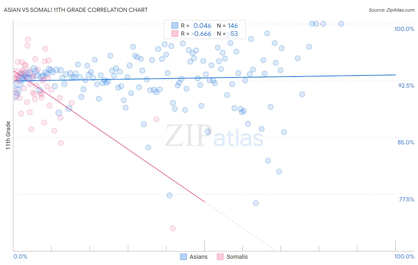 The statistical analysis conducted on geographies consisting of 550,778,127 people shows no correlation between the proportion of Asians and percentage of population with at least 11th grade education in the United States with a correlation coefficient (R) of 0.046 and weighted average of 92.5%. Similarly, the statistical analysis conducted on geographies consisting of 99,330,527 people shows a significant negative correlation between the proportion of Somalis and percentage of population with at least 11th grade education in the United States with a correlation coefficient (R) of -0.666 and weighted average of 92.1%, a difference of 0.50%.