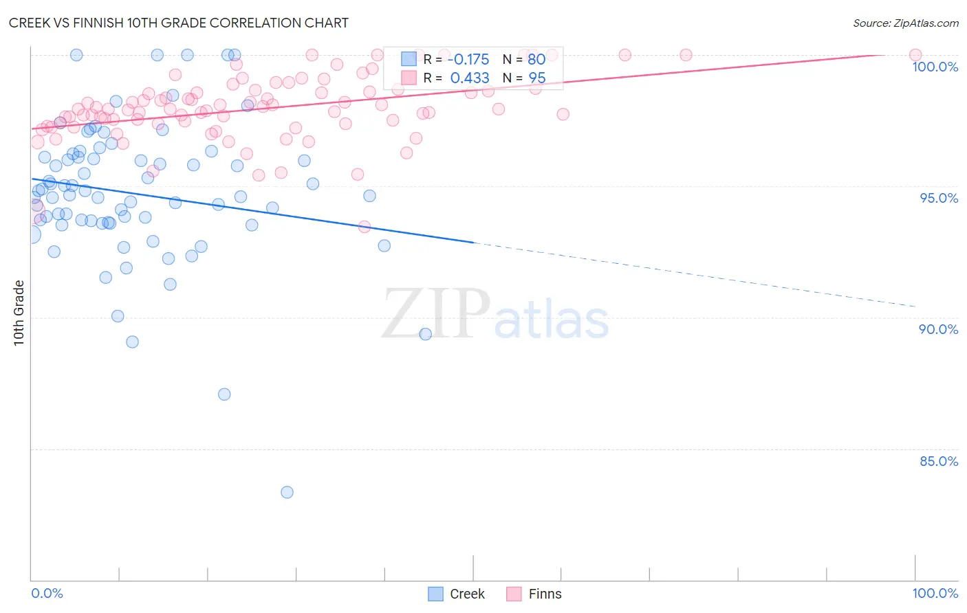 In terms of 10th grade, the demographic groups most similar to Creek are Immigrants from Russia (94.3%, a difference of 0.010%), Osage (94.2%, a difference of 0.010%), Immigrants from Eastern Europe (94.3%, a difference of 0.020%), Immigrants from Korea (94.2%, a difference of 0.020%), and Iroquois (94.3%, a difference of 0.030%).