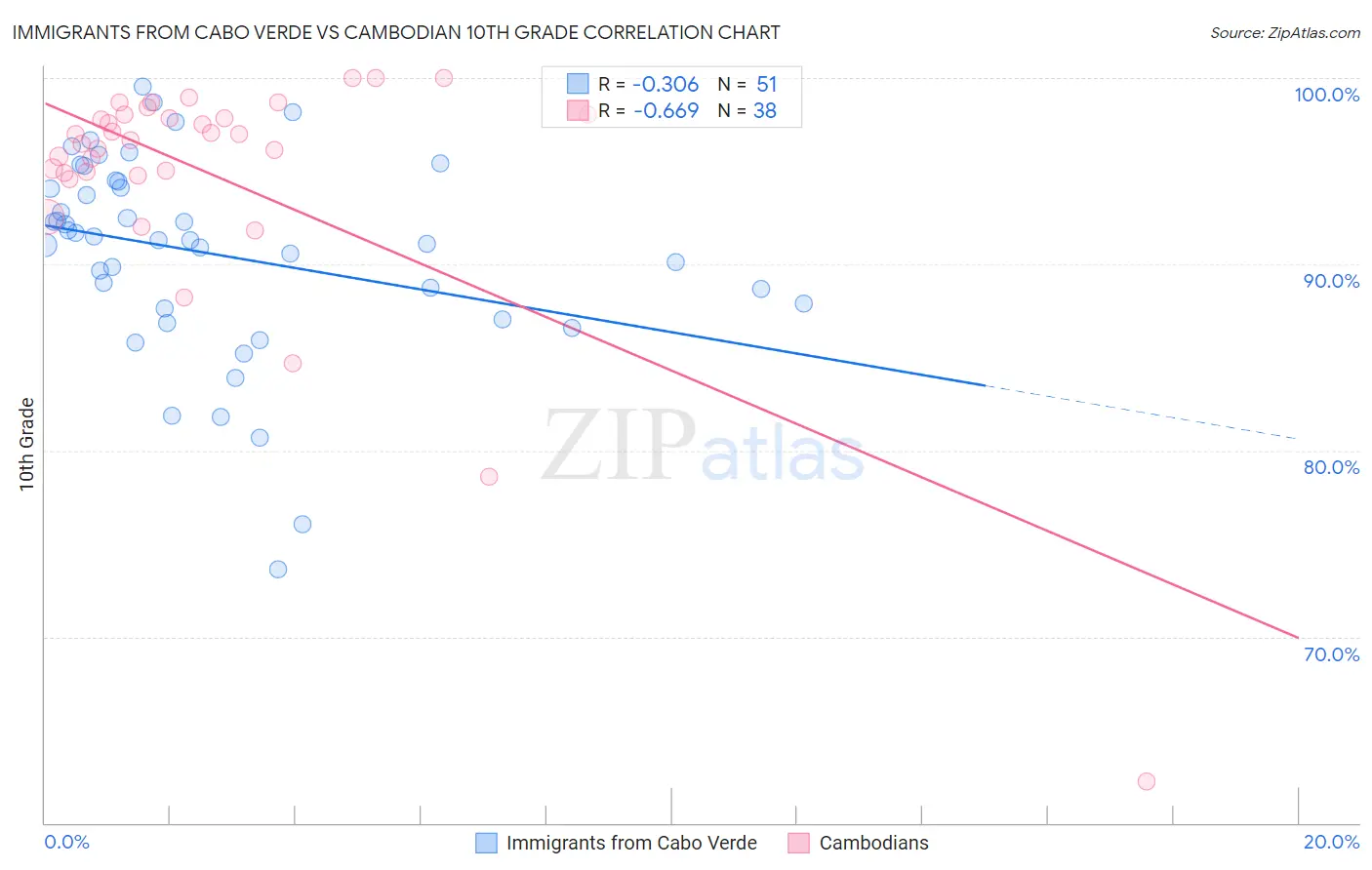 Immigrants from Cabo Verde vs Cambodian 10th Grade Correlation Chart