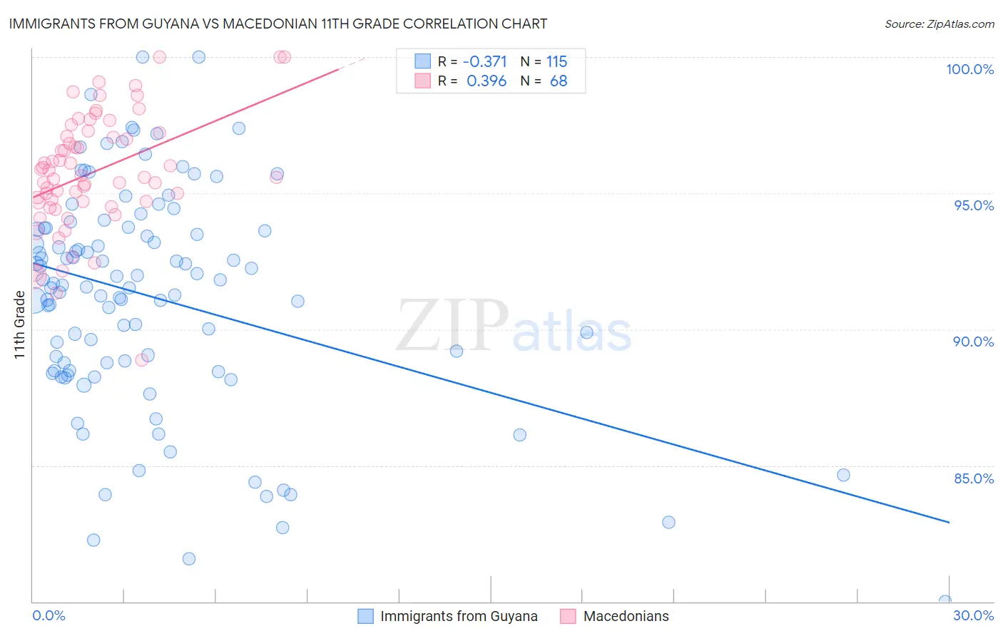 Immigrants from Guyana vs Macedonian 11th Grade Correlation Chart