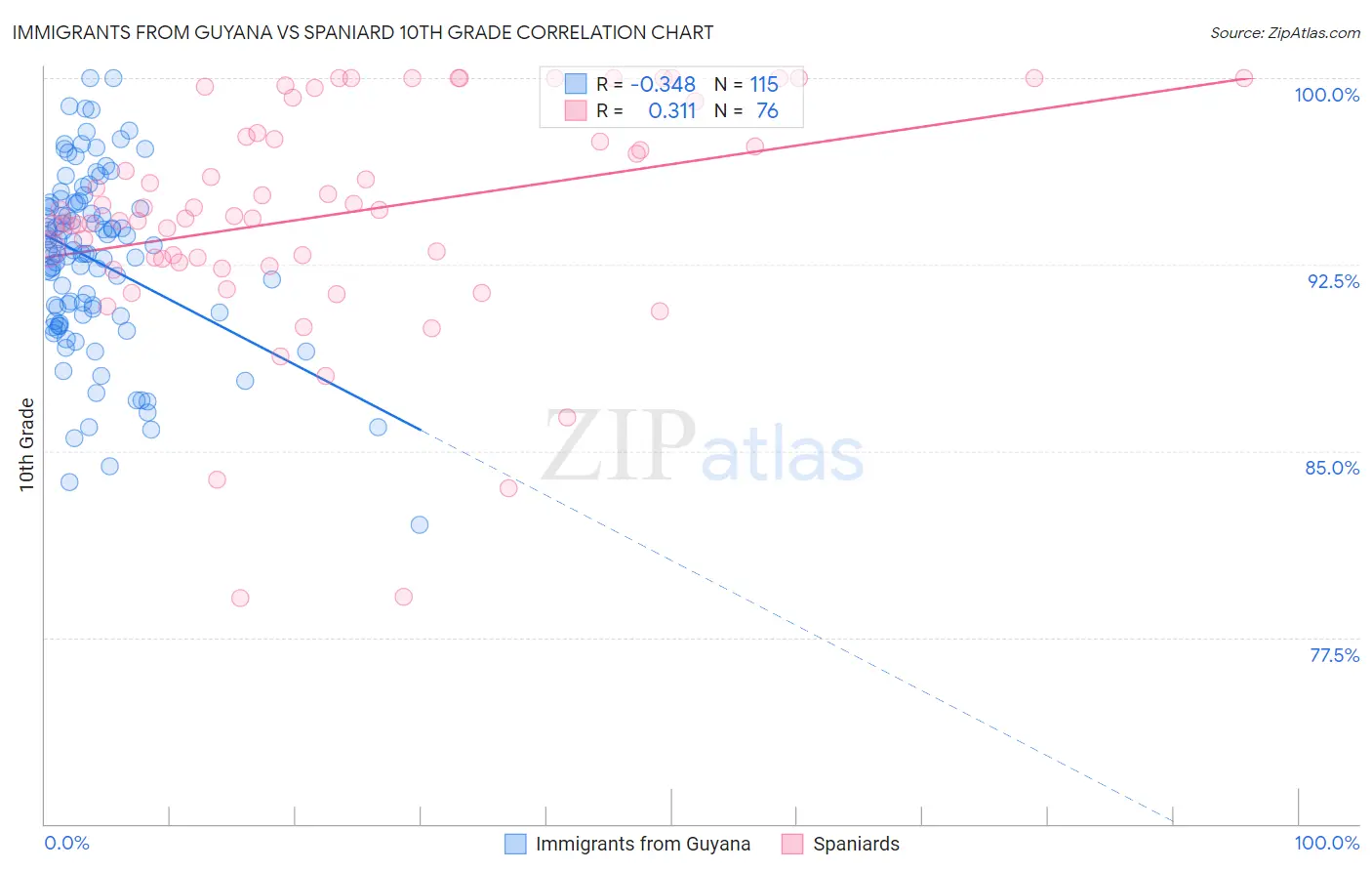 Immigrants from Guyana vs Spaniard 10th Grade Correlation Chart