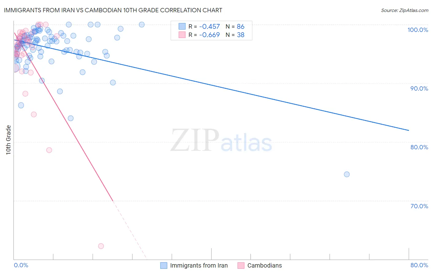 Immigrants from Iran vs Cambodian 10th Grade Correlation Chart