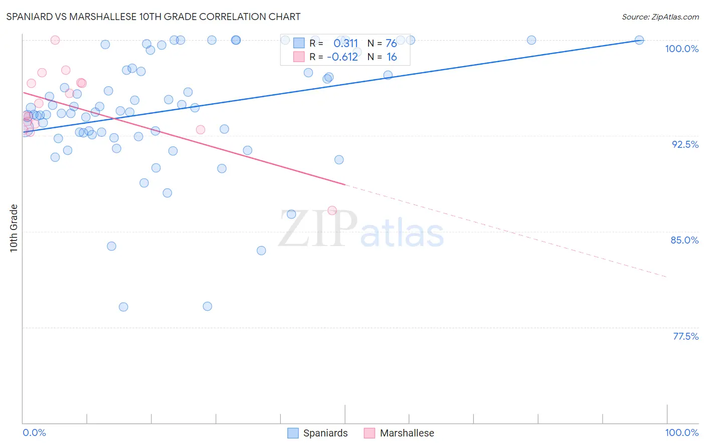In terms of 10th grade, the demographic groups most similar to Spaniards are Argentinean (93.7%, a difference of 0.0%), French American Indian (93.7%, a difference of 0.010%), Immigrants from Nepal (93.7%, a difference of 0.010%), Immigrants from Albania (93.8%, a difference of 0.020%), and Immigrants from Venezuela (93.8%, a difference of 0.030%). Similarly, the demographic groups most similar to Marshallese are Immigrants from Pakistan (93.6%, a difference of 0.010%), Laotian (93.6%, a difference of 0.010%), Immigrants from Eastern Asia (93.6%, a difference of 0.020%), Liberian (93.6%, a difference of 0.020%), and Choctaw (93.6%, a difference of 0.030%).