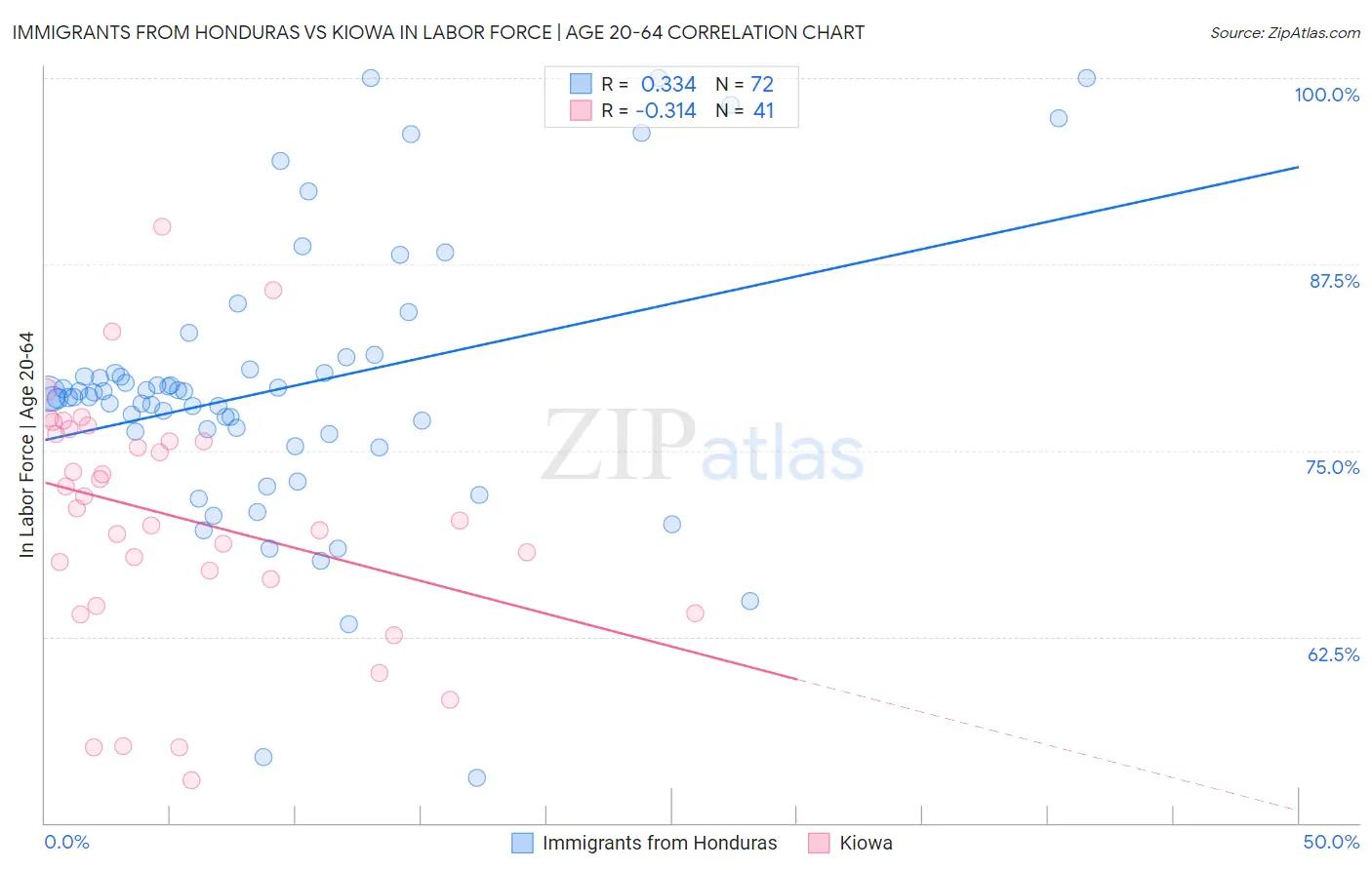 Immigrants from Honduras vs Kiowa In Labor Force | Age 20-64 Correlation Chart