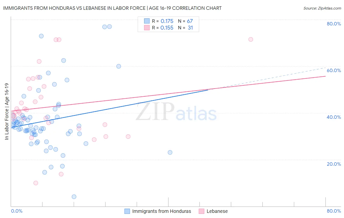 Immigrants from Honduras vs Lebanese In Labor Force | Age 16-19 Correlation Chart