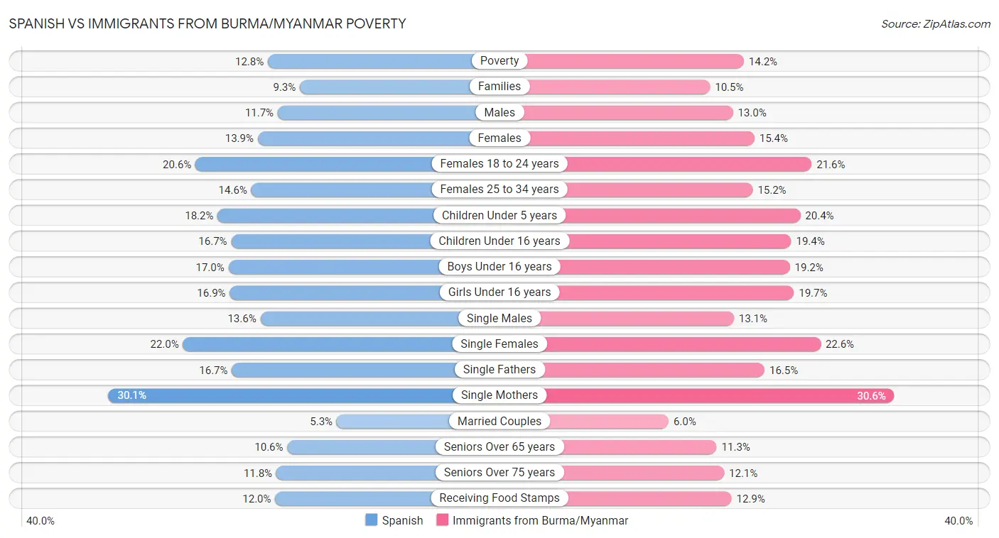 When considering poverty, the most significant differences between Spanish and Immigrants from Burma/Myanmar communities in the United States are seen in child poverty among girls under 16 (16.9% compared to 19.7%, a difference of 16.3%), child poverty under the age of 16 (16.7% compared to 19.4%, a difference of 15.6%), and married-couple family poverty (5.3% compared to 6.0%, a difference of 14.2%). Conversely, both communities are more comparable in terms of single father poverty (16.7% compared to 16.5%, a difference of 1.3%), single mother poverty (30.1% compared to 30.6%, a difference of 1.6%), and seniors poverty over the age of 75 (11.8% compared to 12.1%, a difference of 1.9%).