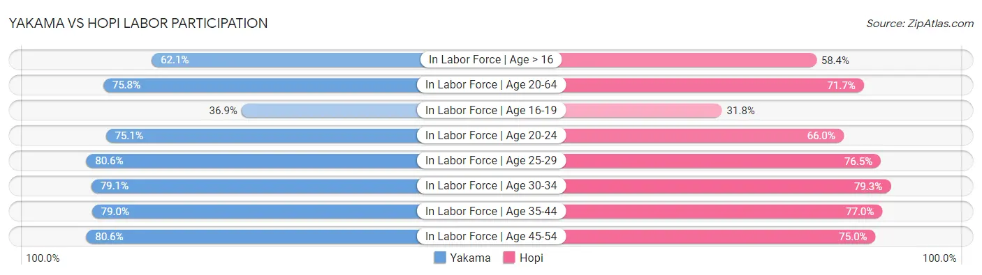 When considering labor participation, the most significant differences between Yakama and Hopi communities in the United States are seen in in labor force | age 16-19 (36.9% compared to 31.8%, a difference of 16.0%), in labor force | age 20-24 (75.1% compared to 66.0%, a difference of 13.7%), and in labor force | age 45-54 (80.6% compared to 75.0%, a difference of 7.4%). Conversely, both communities are more comparable in terms of in labor force | age 30-34 (79.1% compared to 79.3%, a difference of 0.15%), in labor force | age 35-44 (79.0% compared to 77.0%, a difference of 2.6%), and in labor force | age 25-29 (80.6% compared to 76.5%, a difference of 5.3%).