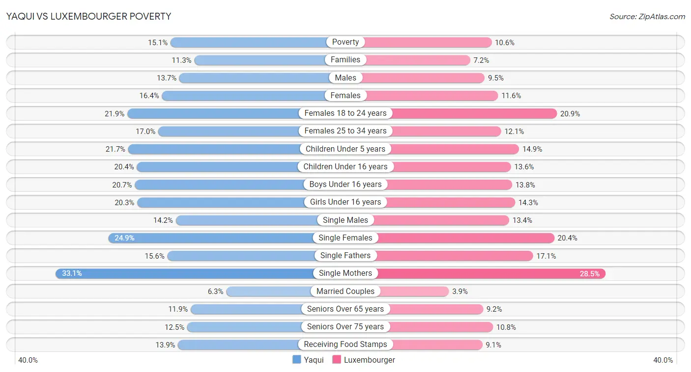 When considering poverty, the most significant differences between Yaqui and Luxembourger communities in the United States are seen in married-couple family poverty (6.3% compared to 3.9%, a difference of 63.0%), family poverty (11.3% compared to 7.2%, a difference of 57.1%), and receiving food stamps (13.9% compared to 9.1%, a difference of 52.1%). Conversely, both communities are more comparable in terms of female poverty among 18-24 year olds (21.9% compared to 20.9%, a difference of 4.8%), single male poverty (14.2% compared to 13.4%, a difference of 6.7%), and single father poverty (15.6% compared to 17.1%, a difference of 9.8%).