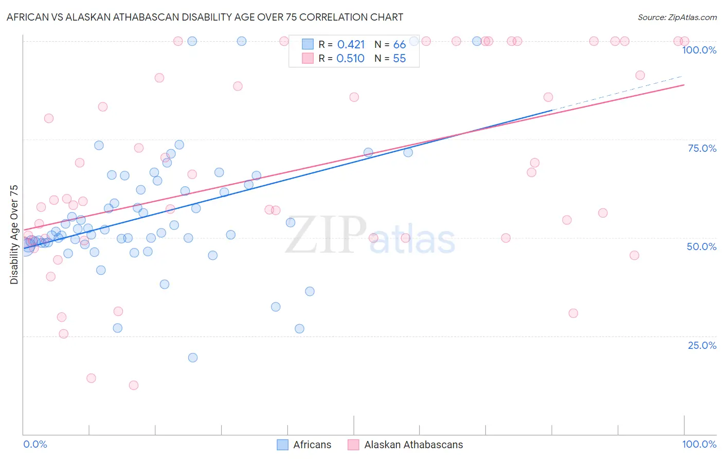 African vs Alaskan Athabascan Disability Age Over 75 Correlation Chart