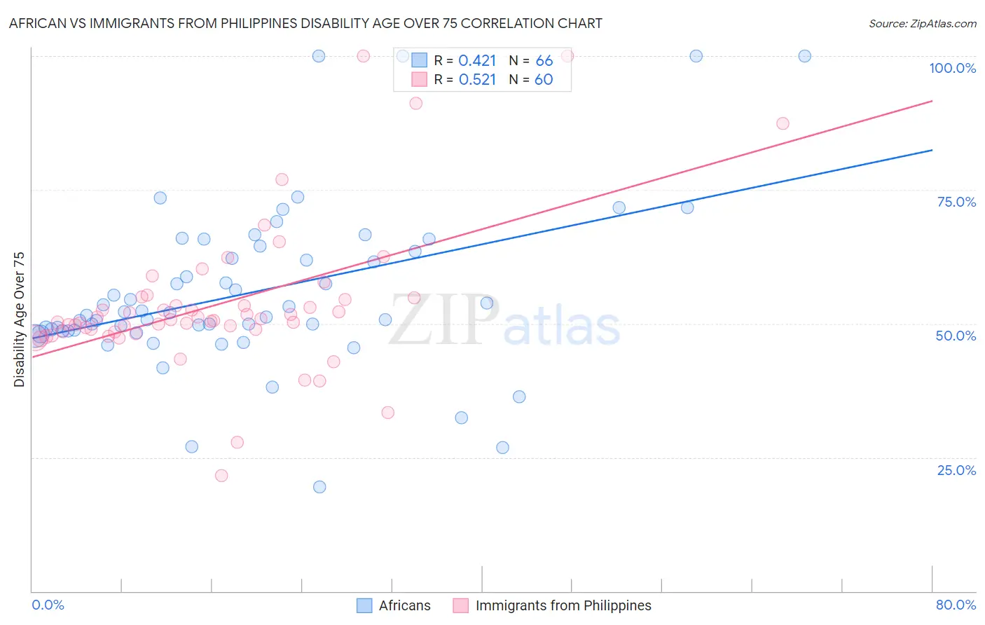 African vs Immigrants from Philippines Disability Age Over 75 Correlation Chart