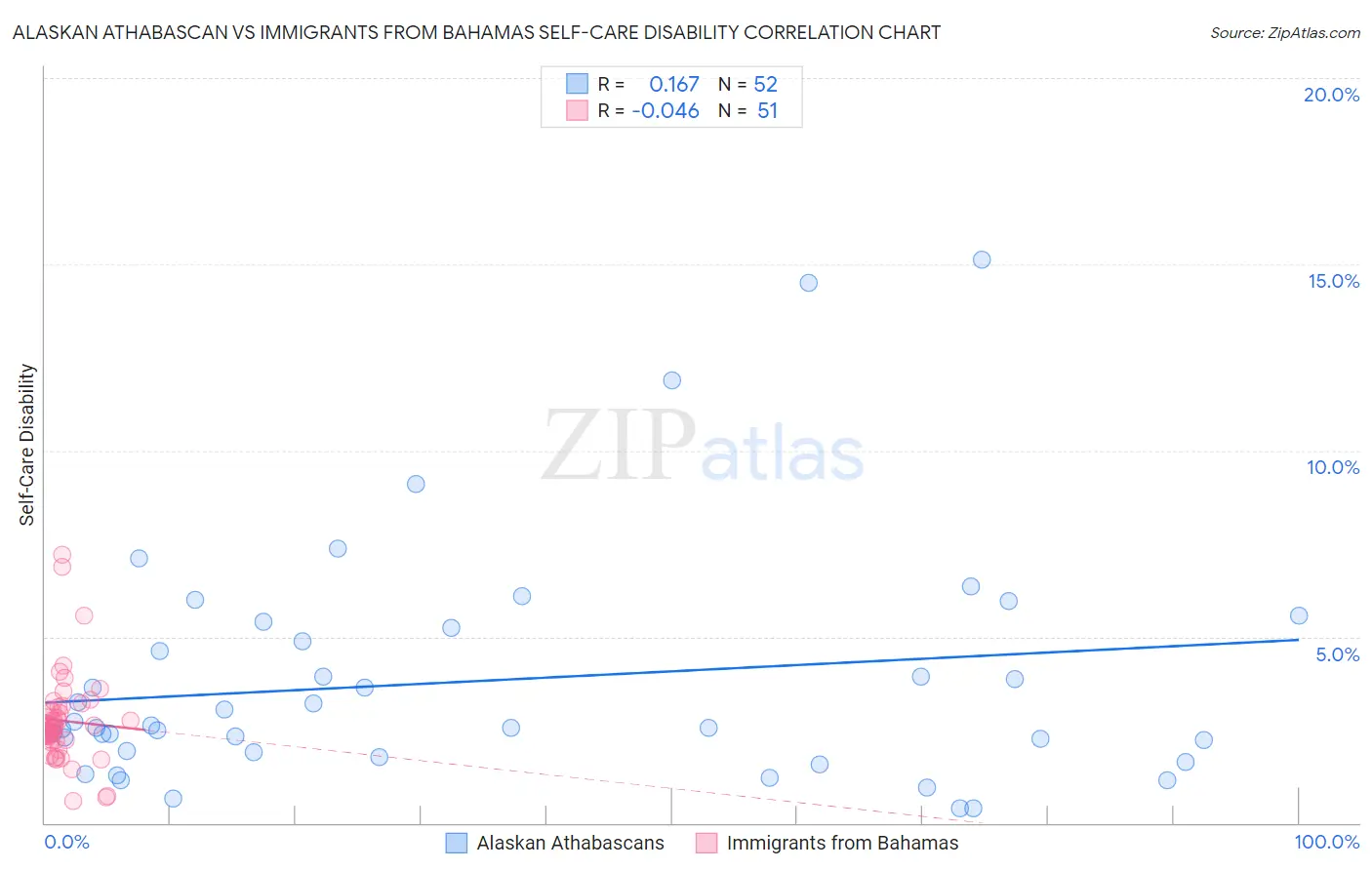Alaskan Athabascan vs Immigrants from Bahamas Self-Care Disability Correlation Chart