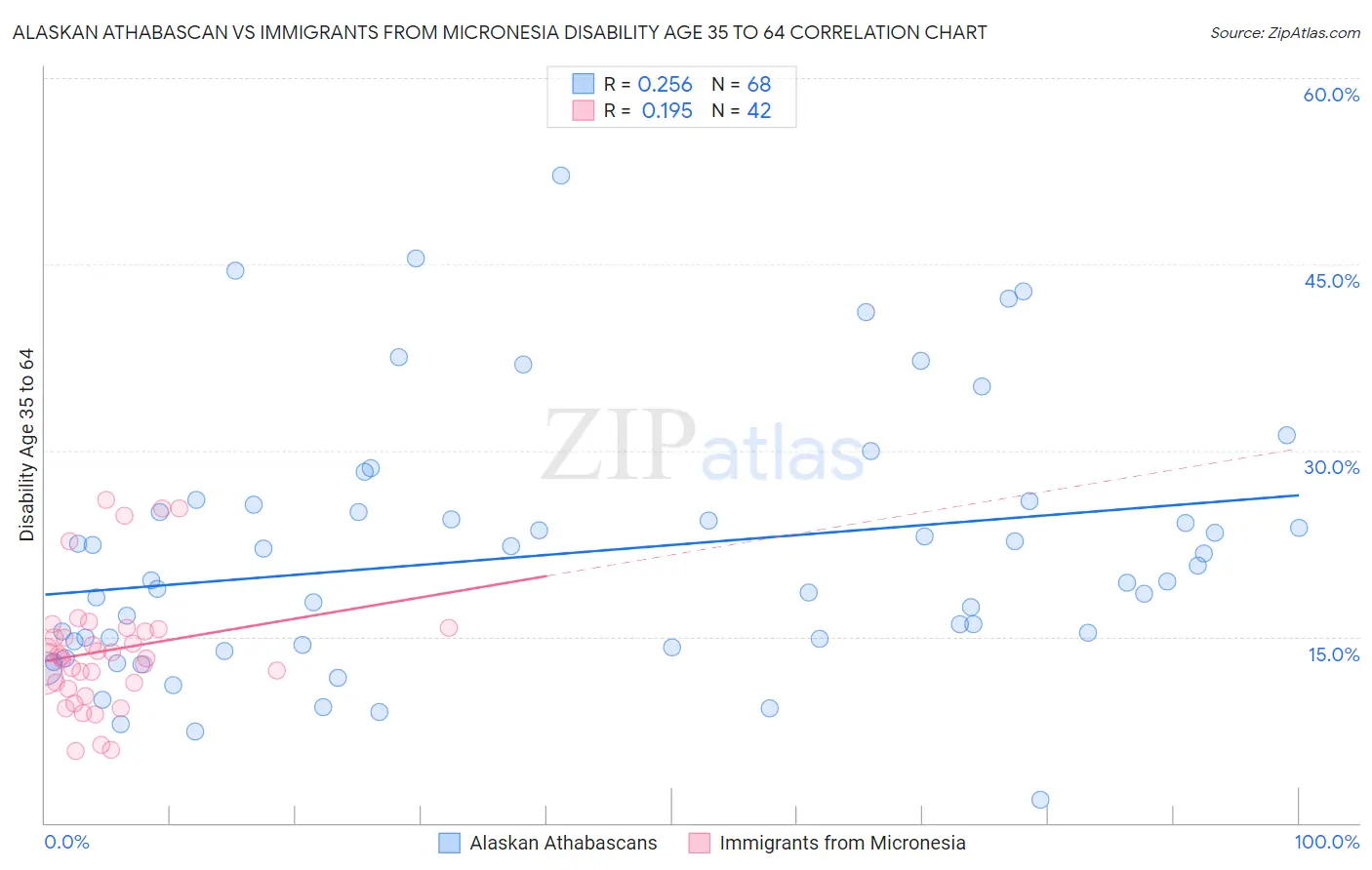 Alaskan Athabascan vs Immigrants from Micronesia Disability Age 35 to 64 Correlation Chart