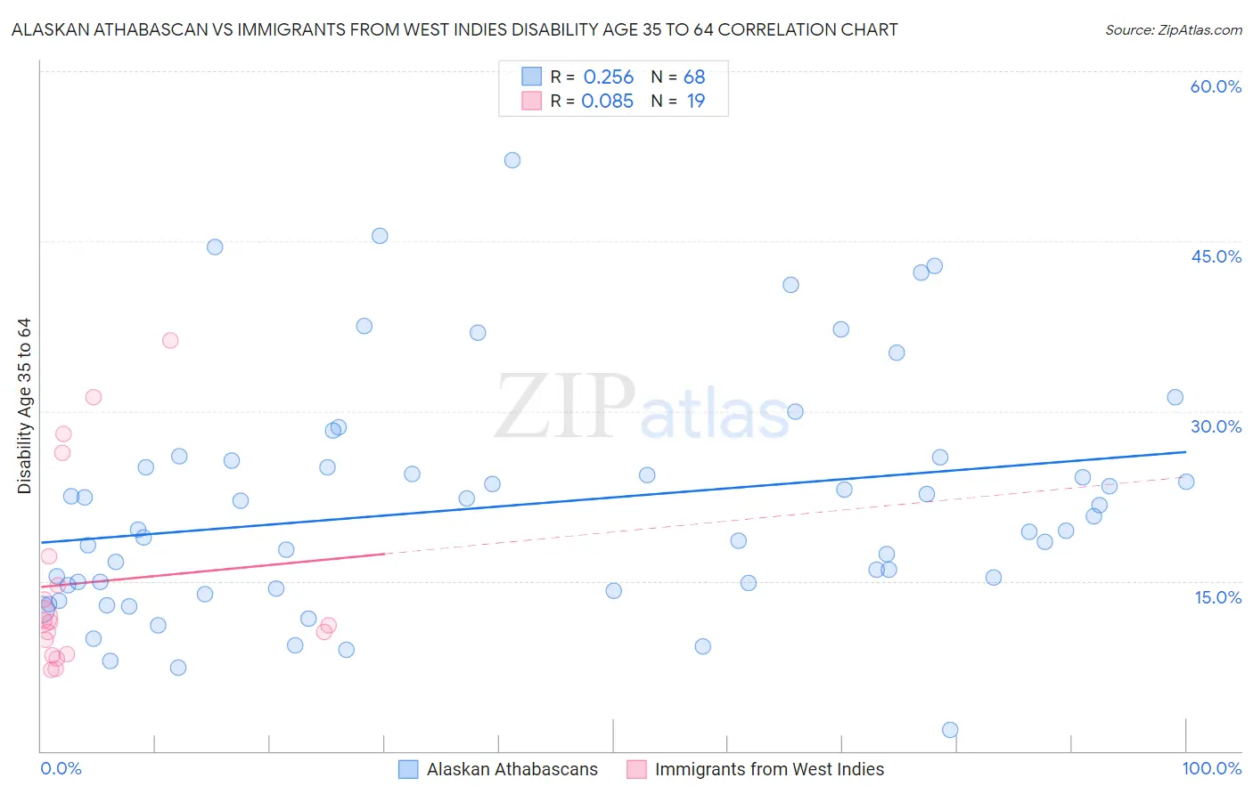 Alaskan Athabascan vs Immigrants from West Indies Disability Age 35 to 64 Correlation Chart