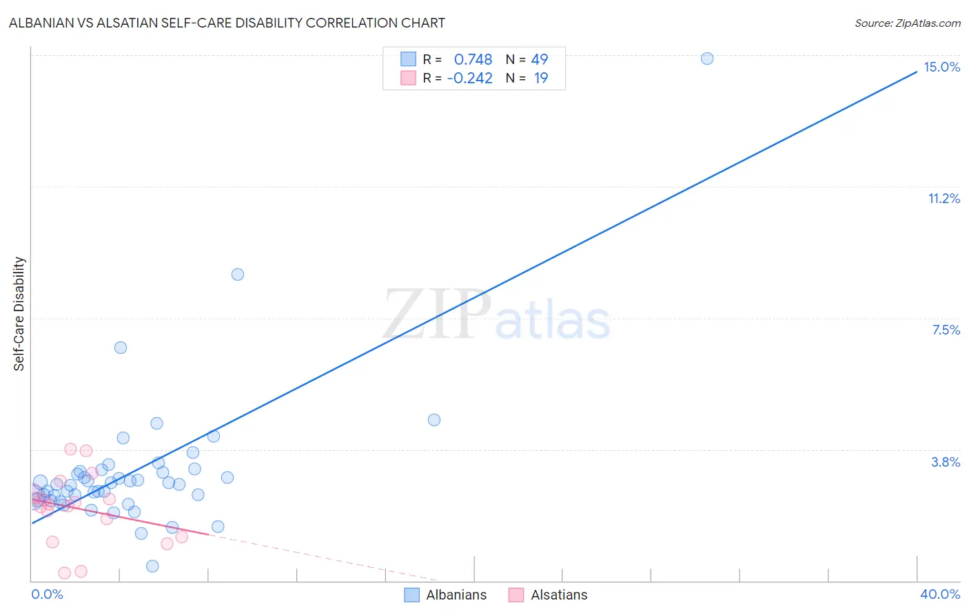 The statistical analysis conducted on geographies consisting of 193,148,254 people shows a strong positive correlation between the proportion of Albanians and percentage of population with self-care disability in the United States with a correlation coefficient (R) of 0.748 and weighted average of 2.6%. Similarly, the statistical analysis conducted on geographies consisting of 82,671,639 people shows a weak negative correlation between the proportion of Alsatians and percentage of population with self-care disability in the United States with a correlation coefficient (R) of -0.242 and weighted average of 2.4%, a difference of 8.3%.