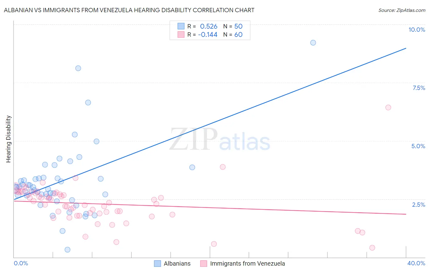Albanian vs Immigrants from Venezuela Hearing Disability Correlation Chart