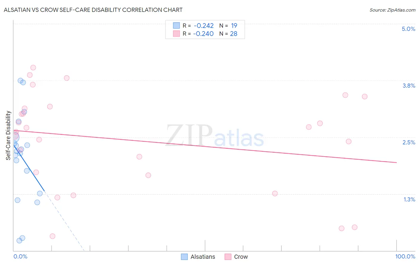 The statistical analysis conducted on geographies consisting of 82,671,639 people shows a weak negative correlation between the proportion of Alsatians and percentage of population with self-care disability in the United States with a correlation coefficient (R) of -0.242 and weighted average of 2.4%. Similarly, the statistical analysis conducted on geographies consisting of 59,179,234 people shows a weak negative correlation between the proportion of Crow and percentage of population with self-care disability in the United States with a correlation coefficient (R) of -0.240 and weighted average of 2.5%, a difference of 5.7%.