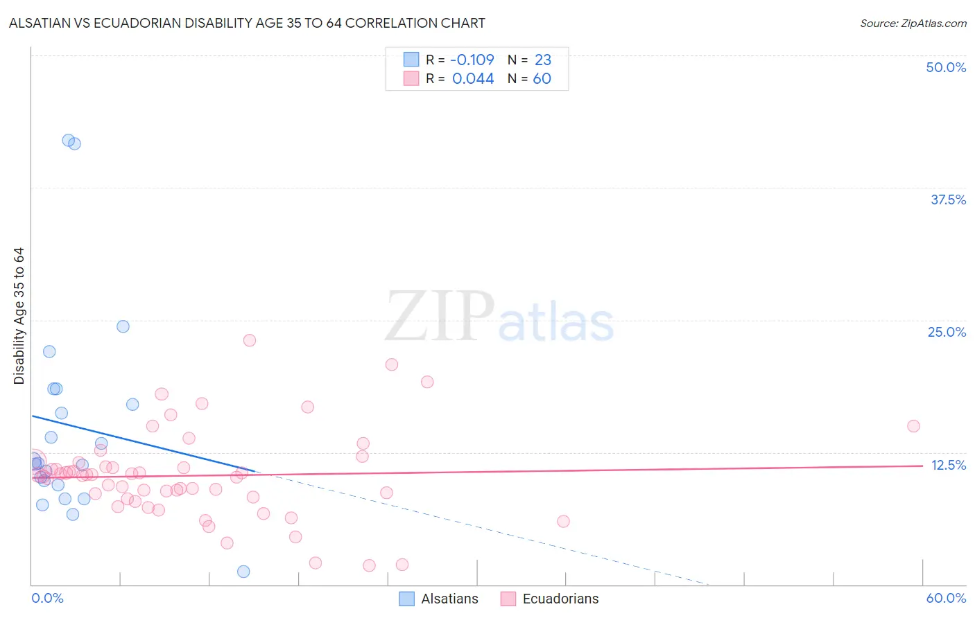 The statistical analysis conducted on geographies consisting of 82,678,494 people shows a poor negative correlation between the proportion of Alsatians and percentage of population with a disability between the ages 34 and 64 in the United States with a correlation coefficient (R) of -0.109 and weighted average of 11.8%. Similarly, the statistical analysis conducted on geographies consisting of 317,605,985 people shows no correlation between the proportion of Ecuadorians and percentage of population with a disability between the ages 34 and 64 in the United States with a correlation coefficient (R) of 0.044 and weighted average of 10.7%, a difference of 10.5%.