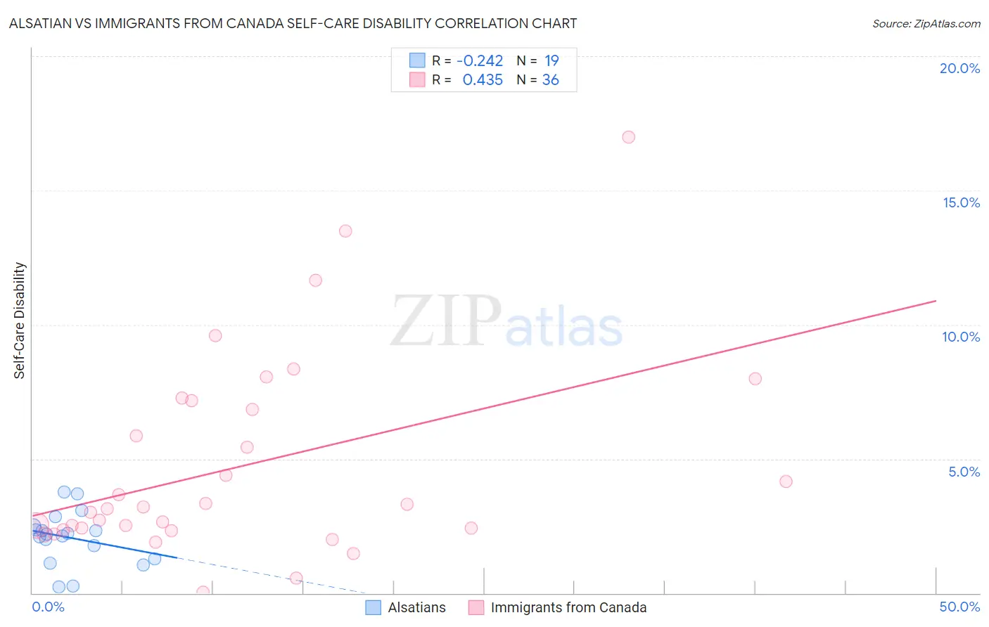 Alsatian vs Immigrants from Canada Self-Care Disability Correlation Chart