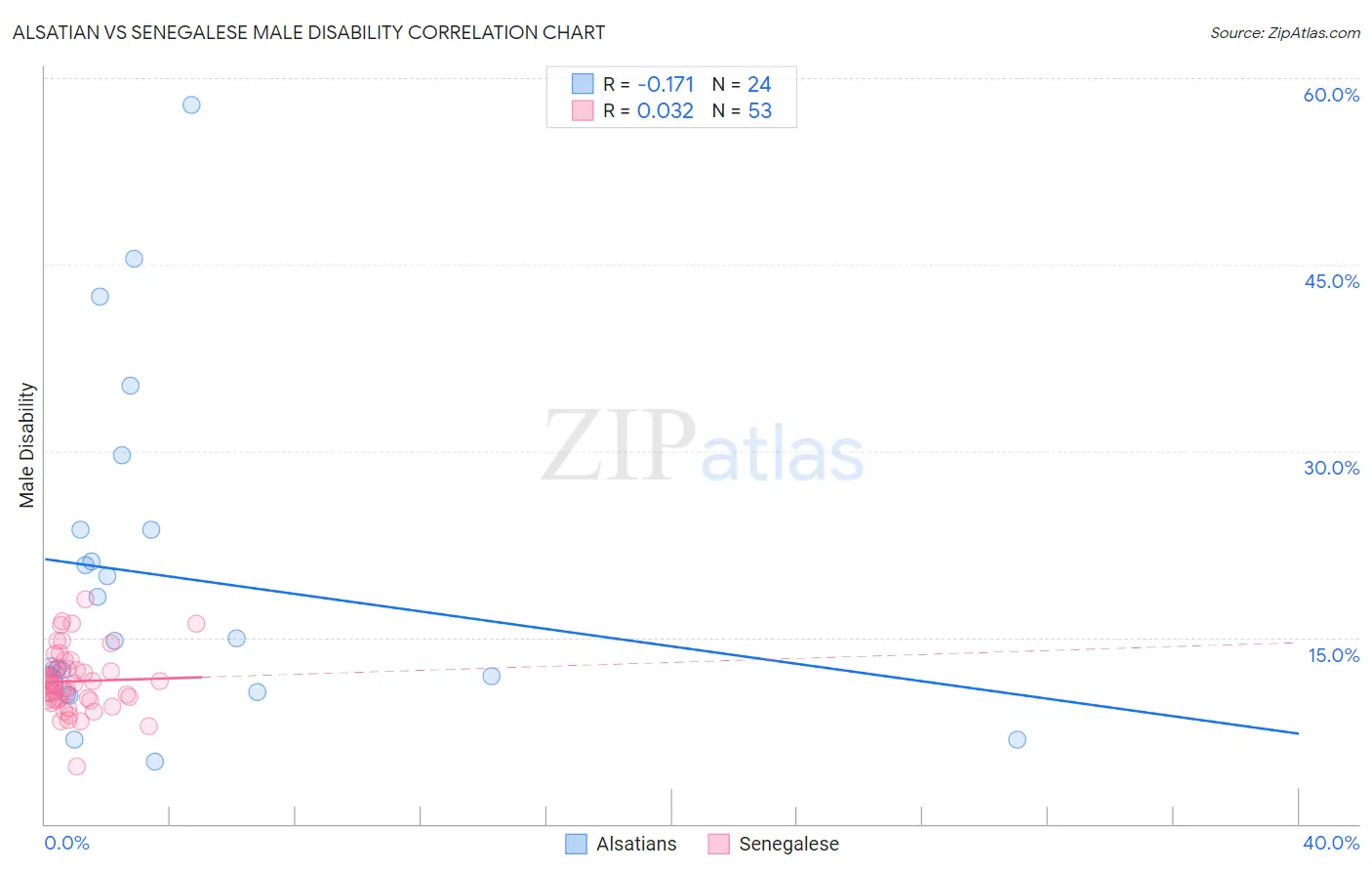 The statistical analysis conducted on geographies consisting of 82,682,247 people shows a poor negative correlation between the proportion of Alsatians and percentage of males with a disability in the United States with a correlation coefficient (R) of -0.171 and weighted average of 11.7%. Similarly, the statistical analysis conducted on geographies consisting of 78,137,196 people shows no correlation between the proportion of Senegalese and percentage of males with a disability in the United States with a correlation coefficient (R) of 0.032 and weighted average of 11.4%, a difference of 2.9%.