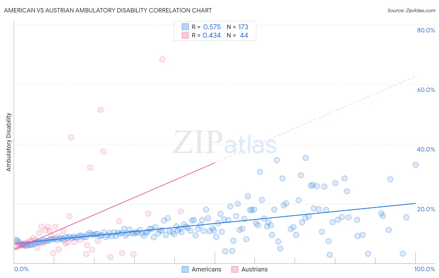 The statistical analysis conducted on geographies consisting of 581,324,022 people shows a substantial positive correlation between the proportion of Americans and percentage of population with ambulatory disability in the United States with a correlation coefficient (R) of 0.575 and weighted average of 7.4%. Similarly, the statistical analysis conducted on geographies consisting of 451,962,555 people shows a moderate positive correlation between the proportion of Austrians and percentage of population with ambulatory disability in the United States with a correlation coefficient (R) of 0.434 and weighted average of 6.1%, a difference of 20.7%.