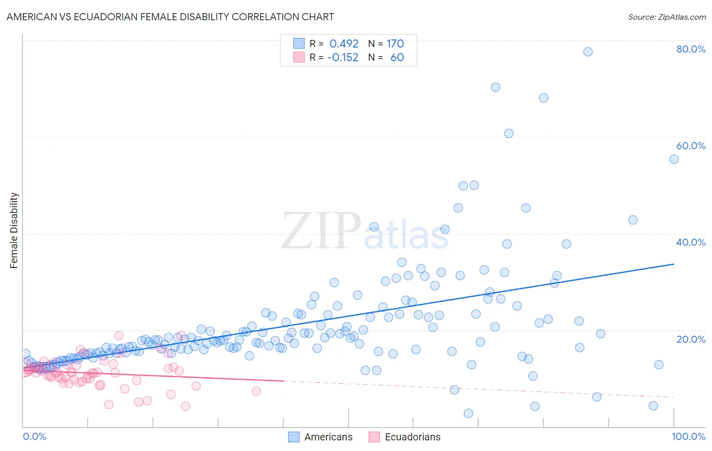 The statistical analysis conducted on geographies consisting of 581,542,152 people shows a moderate positive correlation between the proportion of Americans and percentage of females with a disability in the United States with a correlation coefficient (R) of 0.492 and weighted average of 14.1%. Similarly, the statistical analysis conducted on geographies consisting of 317,804,285 people shows a poor negative correlation between the proportion of Ecuadorians and percentage of females with a disability in the United States with a correlation coefficient (R) of -0.152 and weighted average of 11.9%, a difference of 18.5%.