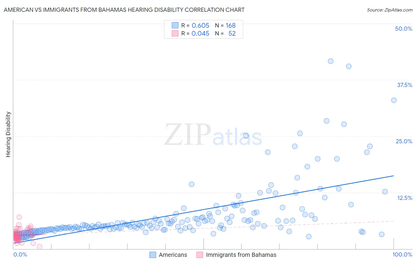 American vs Immigrants from Bahamas Hearing Disability Correlation Chart