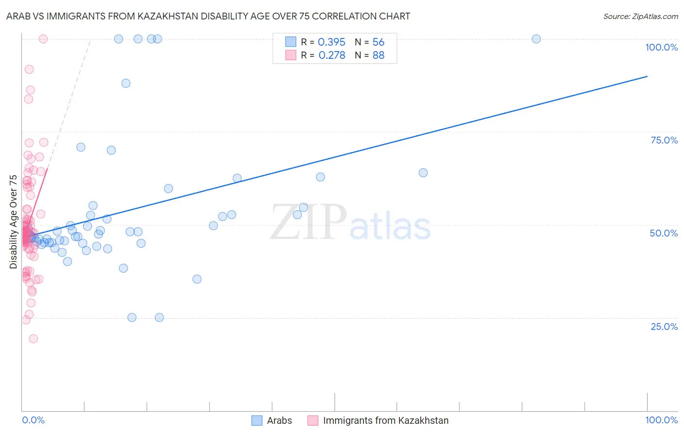 Arab vs Immigrants from Kazakhstan Disability Age Over 75 Correlation Chart