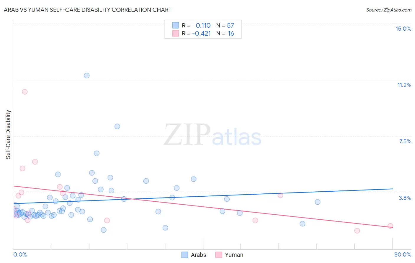 The statistical analysis conducted on geographies consisting of 485,999,863 people shows a poor positive correlation between the proportion of Arabs and percentage of population with self-care disability in the United States with a correlation coefficient (R) of 0.110 and weighted average of 2.4%. Similarly, the statistical analysis conducted on geographies consisting of 40,644,588 people shows a moderate negative correlation between the proportion of Yuman and percentage of population with self-care disability in the United States with a correlation coefficient (R) of -0.421 and weighted average of 2.6%, a difference of 7.2%.