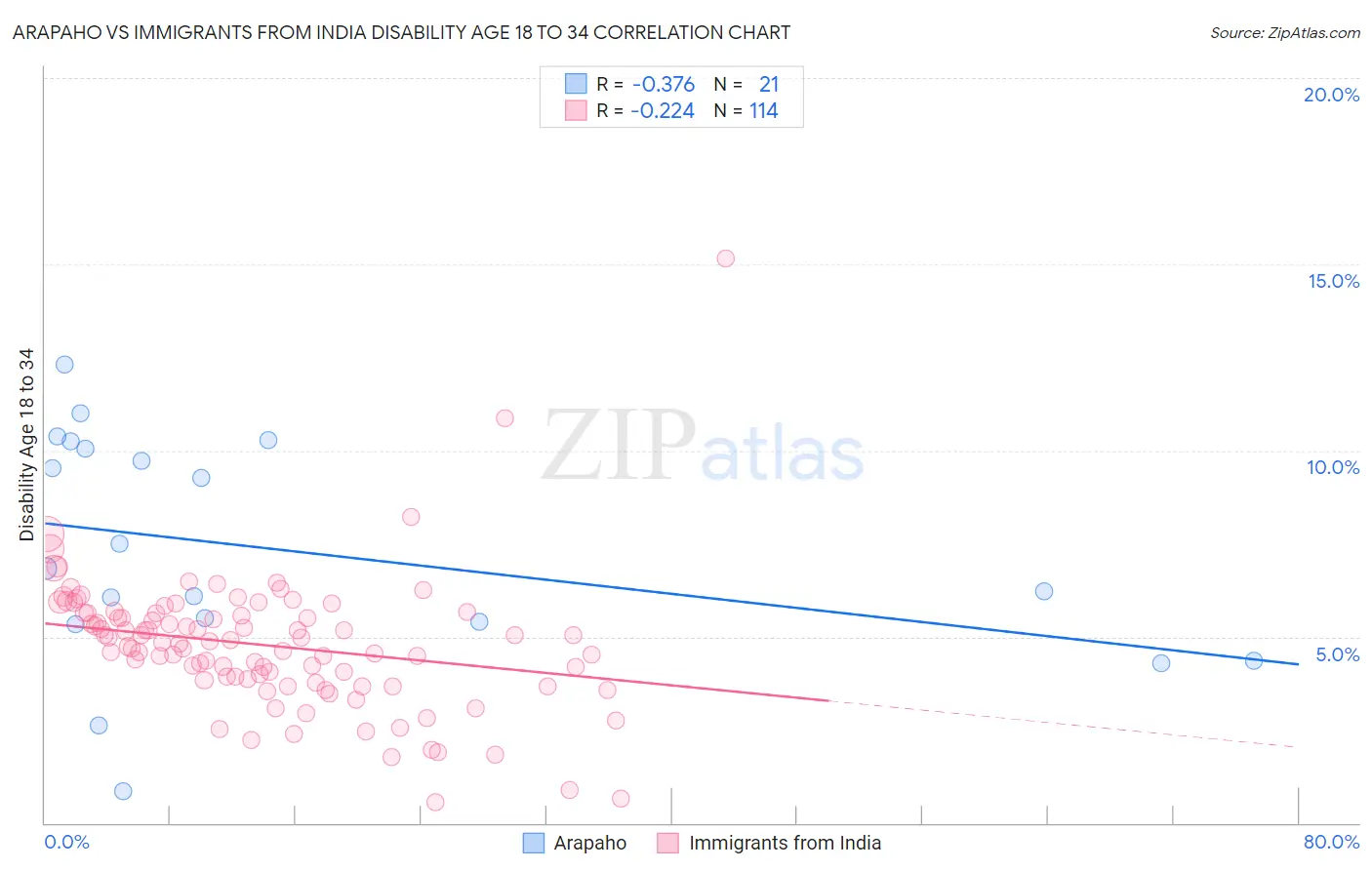 Arapaho vs Immigrants from India Disability Age 18 to 34 Correlation Chart