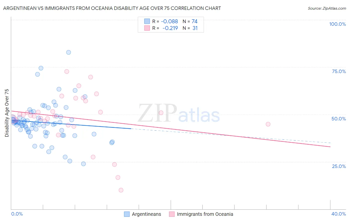 Argentinean vs Immigrants from Oceania Disability Age Over 75 Correlation Chart