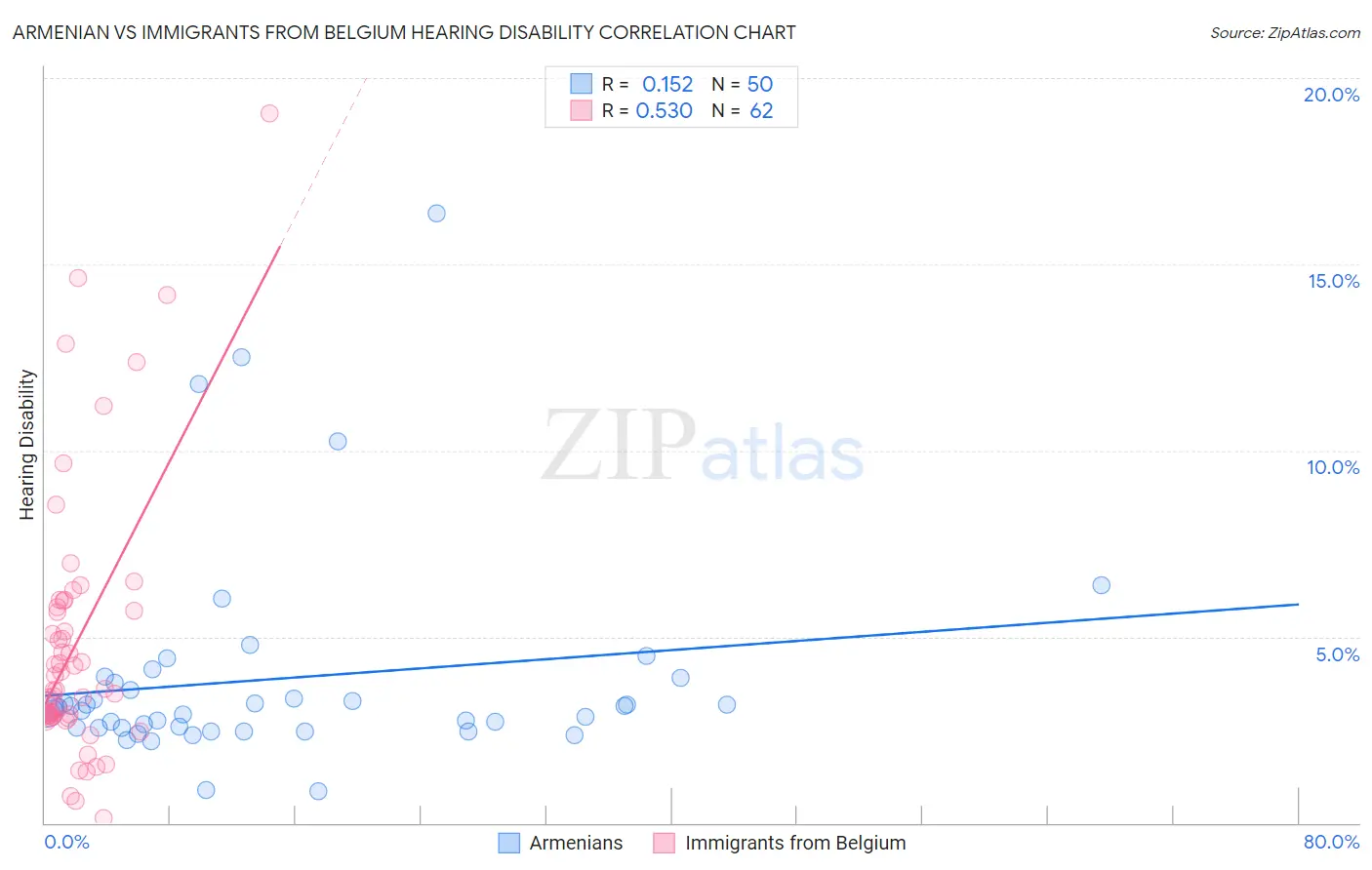 Armenian vs Immigrants from Belgium Hearing Disability Correlation Chart