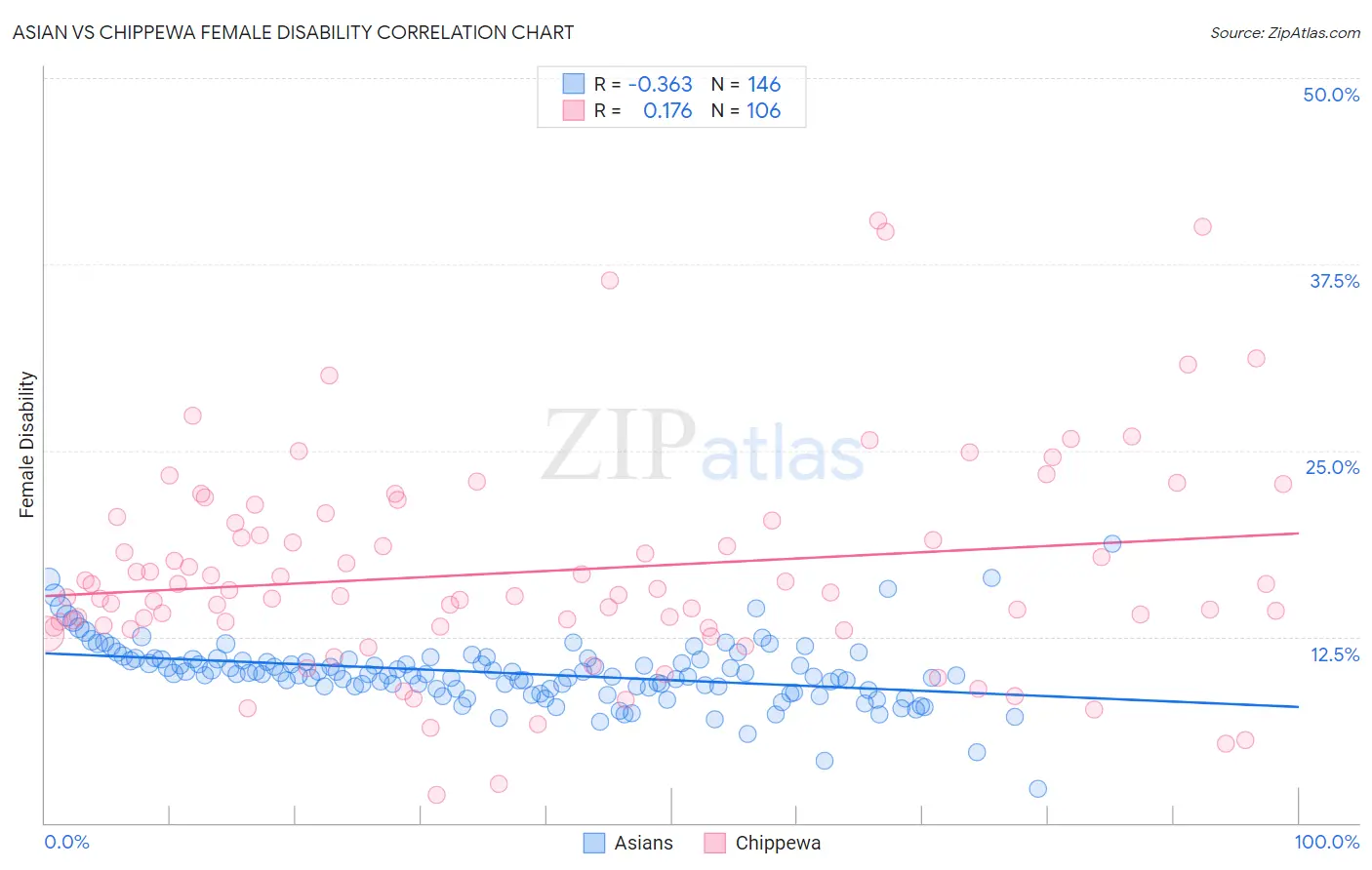 The statistical analysis conducted on geographies consisting of 550,713,500 people shows a mild negative correlation between the proportion of Asians and percentage of females with a disability in the United States with a correlation coefficient (R) of -0.363 and weighted average of 10.9%. Similarly, the statistical analysis conducted on geographies consisting of 215,042,988 people shows a poor positive correlation between the proportion of Chippewa and percentage of females with a disability in the United States with a correlation coefficient (R) of 0.176 and weighted average of 14.0%, a difference of 28.2%.