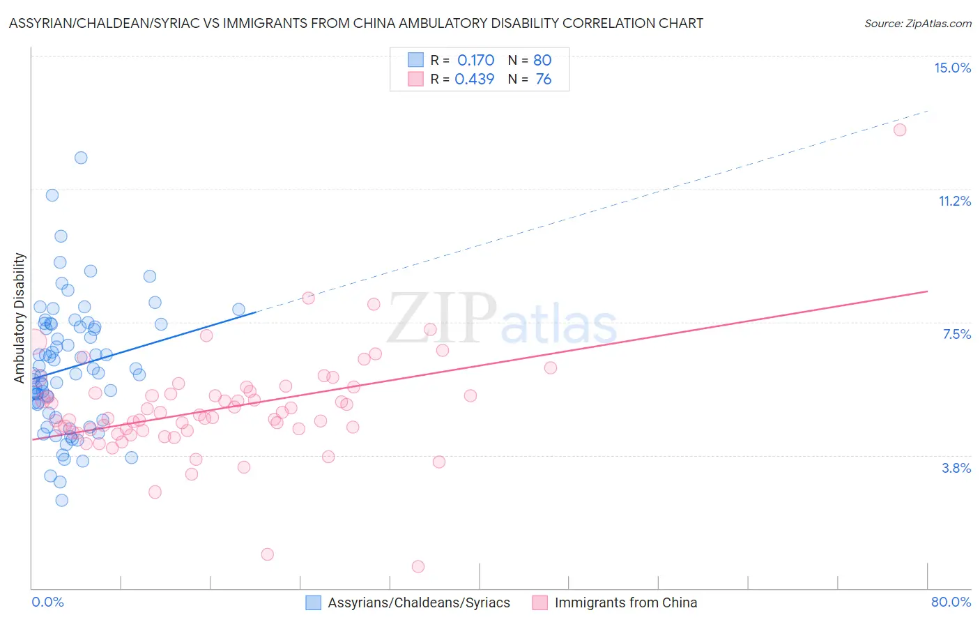 Assyrian/Chaldean/Syriac vs Immigrants from China Ambulatory Disability Correlation Chart