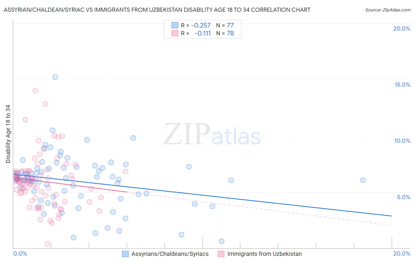 Assyrian/Chaldean/Syriac vs Immigrants from Uzbekistan Disability Age 18 to 34 Correlation Chart