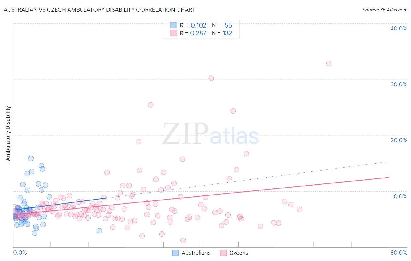 The statistical analysis conducted on geographies consisting of 224,102,055 people shows a poor positive correlation between the proportion of Australians and percentage of population with ambulatory disability in the United States with a correlation coefficient (R) of 0.102 and weighted average of 5.8%. Similarly, the statistical analysis conducted on geographies consisting of 484,584,263 people shows a weak positive correlation between the proportion of Czechs and percentage of population with ambulatory disability in the United States with a correlation coefficient (R) of 0.287 and weighted average of 6.0%, a difference of 3.9%.