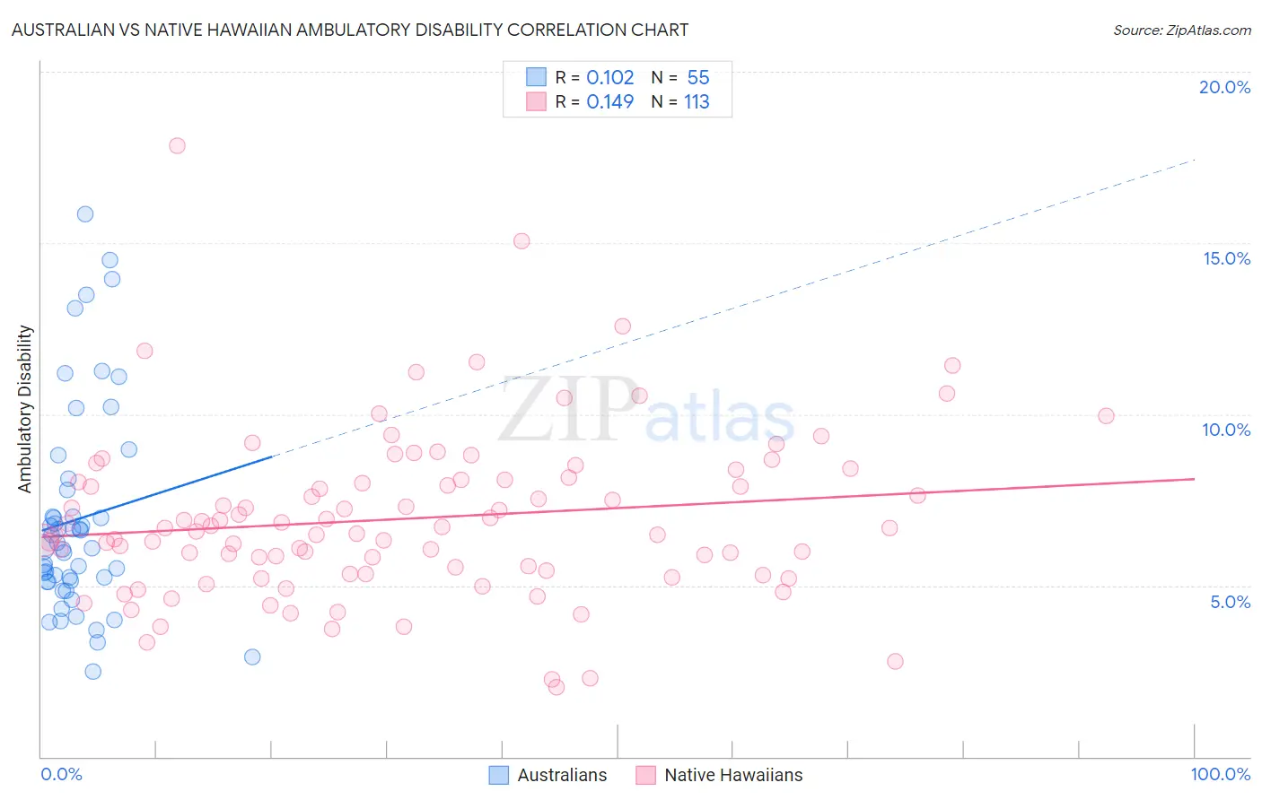 The statistical analysis conducted on geographies consisting of 224,102,055 people shows a poor positive correlation between the proportion of Australians and percentage of population with ambulatory disability in the United States with a correlation coefficient (R) of 0.102 and weighted average of 5.8%. Similarly, the statistical analysis conducted on geographies consisting of 331,921,721 people shows a poor positive correlation between the proportion of Native Hawaiians and percentage of population with ambulatory disability in the United States with a correlation coefficient (R) of 0.149 and weighted average of 6.5%, a difference of 12.5%.