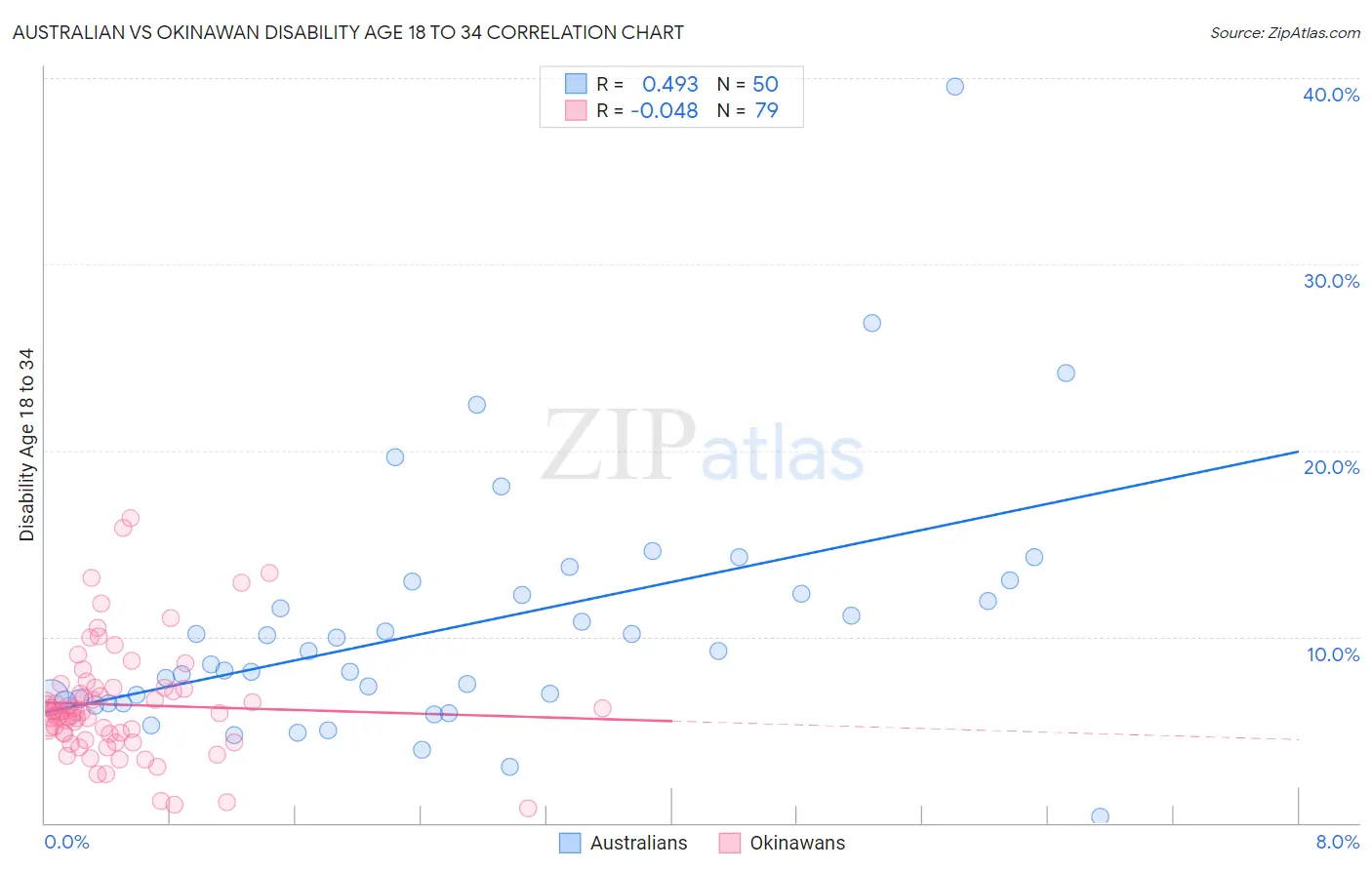 The statistical analysis conducted on geographies consisting of 223,842,296 people shows a moderate positive correlation between the proportion of Australians and percentage of population with a disability between the ages 18 and 35 in the United States with a correlation coefficient (R) of 0.493 and weighted average of 6.8%. Similarly, the statistical analysis conducted on geographies consisting of 73,761,709 people shows no correlation between the proportion of Okinawans and percentage of population with a disability between the ages 18 and 35 in the United States with a correlation coefficient (R) of -0.048 and weighted average of 5.9%, a difference of 14.3%.