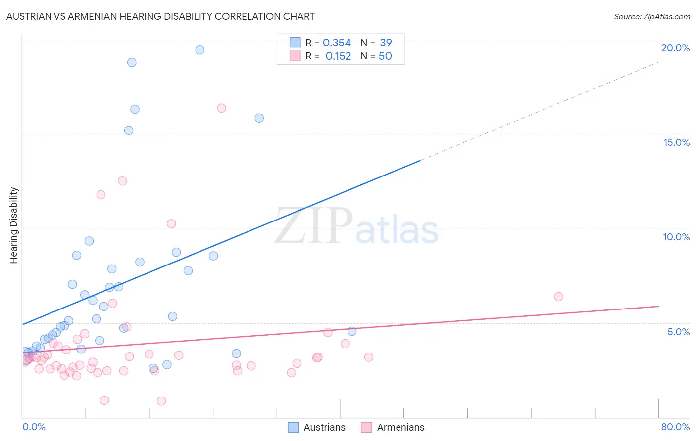 The statistical analysis conducted on geographies consisting of 451,912,592 people shows a mild positive correlation between the proportion of Austrians and percentage of population with hearing disability in the United States with a correlation coefficient (R) of 0.354 and weighted average of 3.4%. Similarly, the statistical analysis conducted on geographies consisting of 310,889,694 people shows a poor positive correlation between the proportion of Armenians and percentage of population with hearing disability in the United States with a correlation coefficient (R) of 0.152 and weighted average of 3.0%, a difference of 12.8%.
