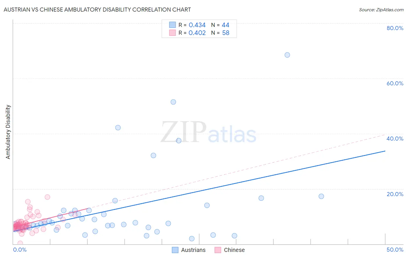 The statistical analysis conducted on geographies consisting of 451,962,555 people shows a moderate positive correlation between the proportion of Austrians and percentage of population with ambulatory disability in the United States with a correlation coefficient (R) of 0.434 and weighted average of 6.1%. Similarly, the statistical analysis conducted on geographies consisting of 64,795,509 people shows a moderate positive correlation between the proportion of Chinese and percentage of population with ambulatory disability in the United States with a correlation coefficient (R) of 0.402 and weighted average of 6.5%, a difference of 5.7%.