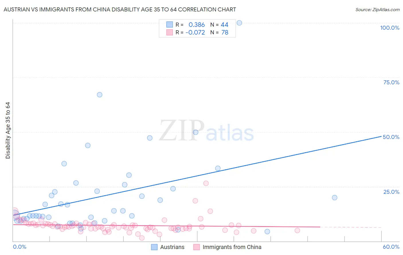 Austrian vs Immigrants from China Disability Age 35 to 64 Correlation Chart