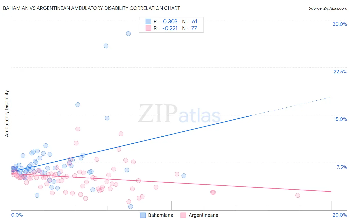 The statistical analysis conducted on geographies consisting of 112,670,822 people shows a mild positive correlation between the proportion of Bahamians and percentage of population with ambulatory disability in the United States with a correlation coefficient (R) of 0.303 and weighted average of 6.6%. Similarly, the statistical analysis conducted on geographies consisting of 297,088,064 people shows a weak negative correlation between the proportion of Argentineans and percentage of population with ambulatory disability in the United States with a correlation coefficient (R) of -0.221 and weighted average of 5.5%, a difference of 20.0%.