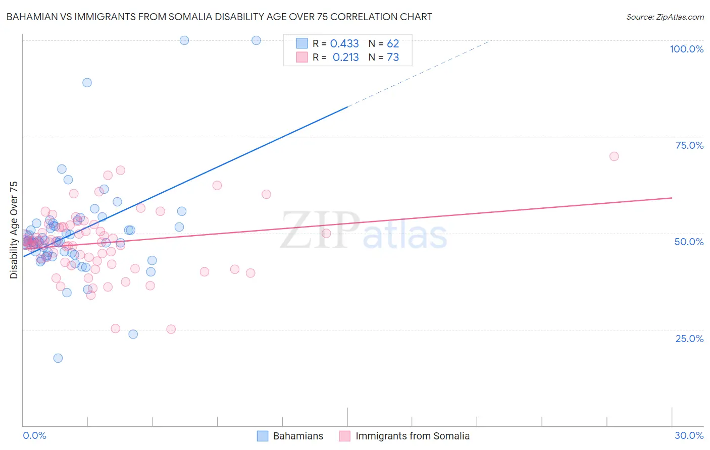 Bahamian vs Immigrants from Somalia Disability Age Over 75 Correlation Chart
