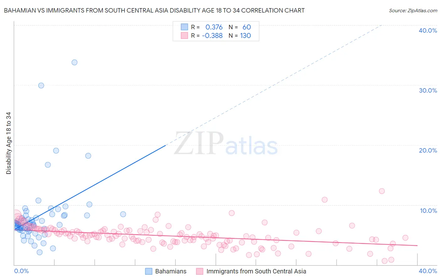 Bahamian vs Immigrants from South Central Asia Disability Age 18 to 34 Correlation Chart