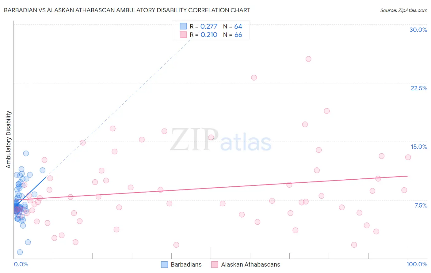 In terms of ambulatory disability, the demographic groups most similar to Barbadians are Yaqui (6.8%, a difference of 0.13%), Immigrants from Barbados (6.8%, a difference of 0.16%), Pennsylvania German (6.8%, a difference of 0.20%), Immigrants from Jamaica (6.8%, a difference of 0.23%), and Immigrants from Caribbean (6.7%, a difference of 0.30%). Similarly, the demographic groups most similar to Alaskan Athabascans are French American Indian (6.9%, a difference of 0.17%), Immigrants from Grenada (6.9%, a difference of 0.18%), Crow (6.9%, a difference of 0.23%), Cape Verdean (6.9%, a difference of 0.30%), and Puget Sound Salish (6.9%, a difference of 0.31%).