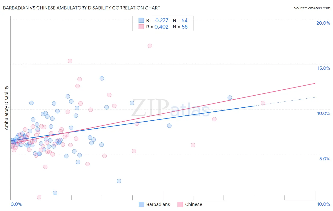The statistical analysis conducted on geographies consisting of 141,286,079 people shows a weak positive correlation between the proportion of Barbadians and percentage of population with ambulatory disability in the United States with a correlation coefficient (R) of 0.277 and weighted average of 6.8%. Similarly, the statistical analysis conducted on geographies consisting of 64,795,509 people shows a moderate positive correlation between the proportion of Chinese and percentage of population with ambulatory disability in the United States with a correlation coefficient (R) of 0.402 and weighted average of 6.5%, a difference of 4.3%.