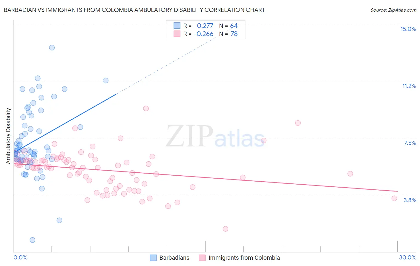 Barbadian vs Immigrants from Colombia Ambulatory Disability Correlation Chart