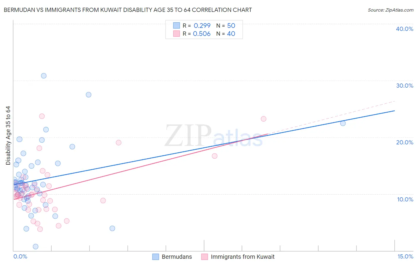 Bermudan vs Immigrants from Kuwait Disability Age 35 to 64 Correlation Chart