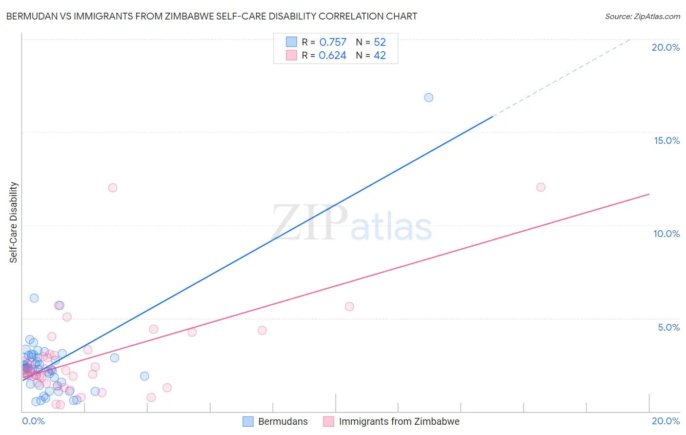 Bermudan vs Immigrants from Zimbabwe Self-Care Disability Correlation Chart