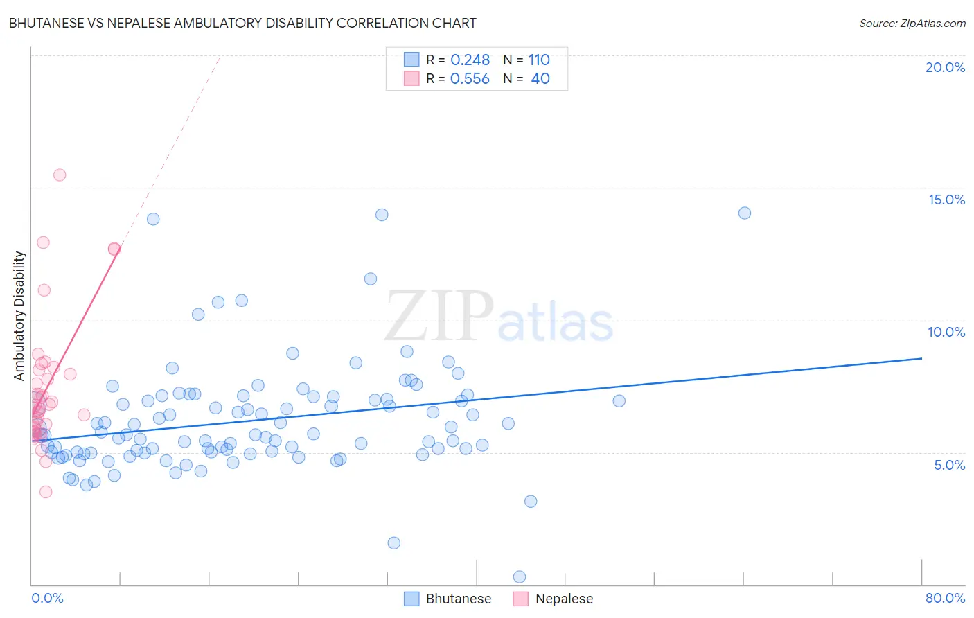 The statistical analysis conducted on geographies consisting of 455,305,094 people shows a weak positive correlation between the proportion of Bhutanese and percentage of population with ambulatory disability in the United States with a correlation coefficient (R) of 0.248 and weighted average of 5.8%. Similarly, the statistical analysis conducted on geographies consisting of 24,521,755 people shows a substantial positive correlation between the proportion of Nepalese and percentage of population with ambulatory disability in the United States with a correlation coefficient (R) of 0.556 and weighted average of 6.6%, a difference of 14.7%.