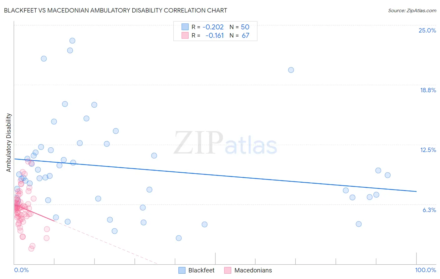 The statistical analysis conducted on geographies consisting of 309,475,903 people shows a weak negative correlation between the proportion of Blackfeet and percentage of population with ambulatory disability in the United States with a correlation coefficient (R) of -0.202 and weighted average of 7.1%. Similarly, the statistical analysis conducted on geographies consisting of 132,658,712 people shows a poor negative correlation between the proportion of Macedonians and percentage of population with ambulatory disability in the United States with a correlation coefficient (R) of -0.161 and weighted average of 6.0%, a difference of 19.0%.